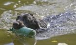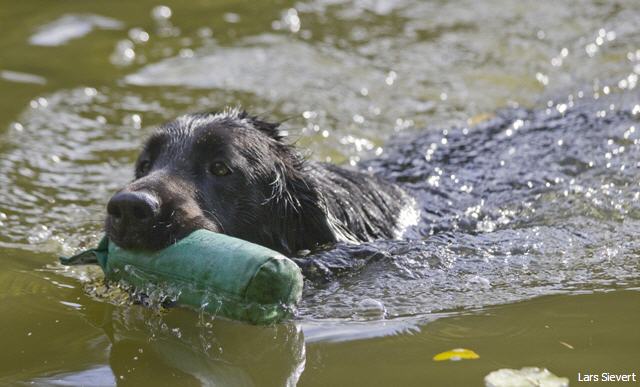 2 Marks werden mittels Dummylauncher hintereinander geschossen. Distanz 20-30m. Abstand von den 2 Marks 5-10m auseinander. Der Hund sollte die 2 Dummies ohne zu tauschen bringen. Während der Hund mit dem 2. Dummy zurückschwimmt, wirft ein Helfer 2-3m vor dem Hund eine Verleitung. Diese Verleitung sollte er am Schluss bringen.